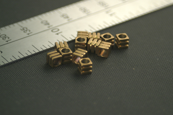 This lot consists of 12 solid raw brass 4mm square cubed ribbed beads. These can be used for necklaces, earrings, bracelets, etc. I have placed a ruler in the photo to show scale.